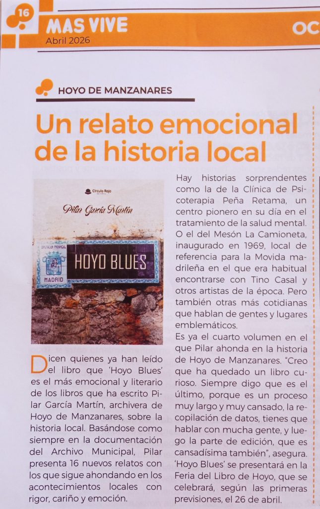 Pilar García Marín, la archivera municipal de Hoyo de Manzanares, presenta su nuevo libro, Hoyo Blues, una obra que reúne una colección de crónicas y relatos ambientados en Hoyo de Manzanares, aunque con historias que, en algunos casos, podrían desarrollarse en cualquier lugar. El libro toma como base documental el Archivo Municipal, aportando un sólido trasfondo histórico y local a las narraciones.